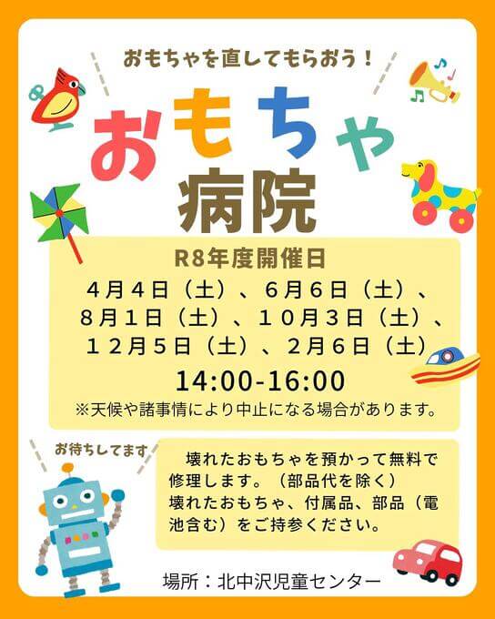 壊れたおもちゃ、付属品、部品(電池含む)をご持参ください。