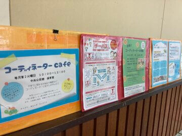 入るとすぐに、児童センターや子育て情報が。(コーディネーターの部屋やcafeの情報も掲示してれていました♪)