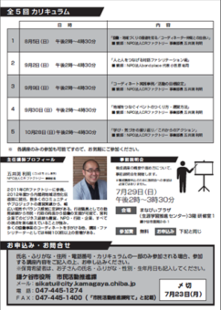 今回実施される「基礎編」3回以上と、基礎編後に実施を予定している「応用編」3回以上を受講された方には終了証をお渡しし、「鎌ケ谷市地域づくりコーディネーター認定制度」における申請が可能になるそうです!