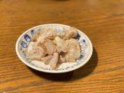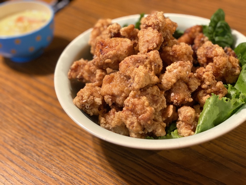 山盛り唐揚げ(うちははちみつ、しょうゆ、しょうが、にんにく、みりん、酒で1日つけます)、