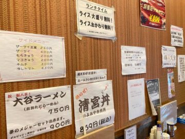 店内はカウンターやテーブル席などがあり、メニューが壁にたくさん貼ってあります。