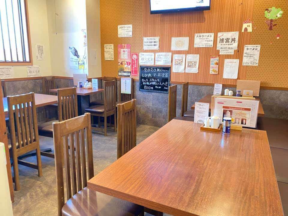 店内はカウンターやテーブル席などがあり、メニューが壁にたくさん貼ってあります。