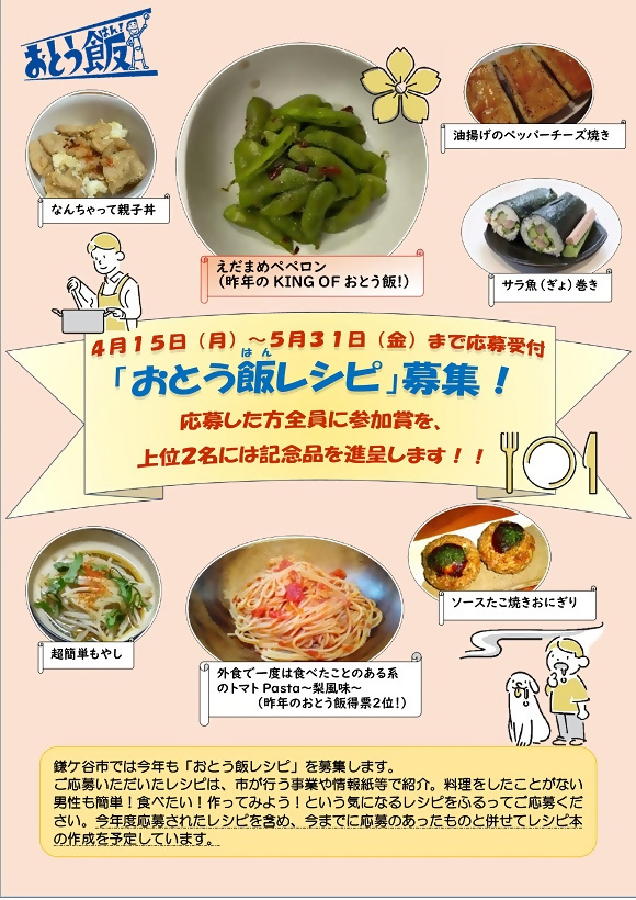 5月31日(金)までの期間、「手早く、簡単に、リーズナブルな食材で、家の調味料を使う、後片付けは最後まで」の5つを心得としたおとう飯(はん)レシピの募集を行っています。