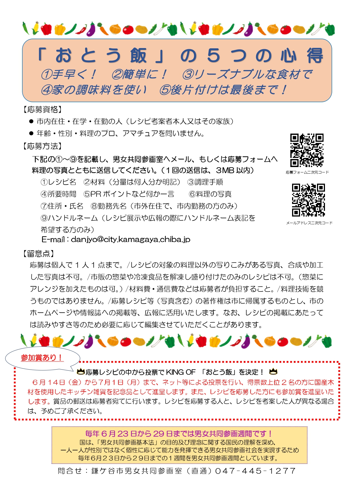 市内に在住・在勤・在学の人で、レシピの考案者またはそのご家族から応募していただけます。料理の腕前を問うものではなく、男性の家事や育児への参加について、料理を通して応援する企画です。
