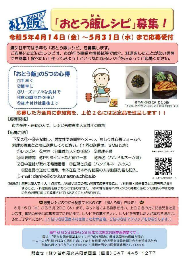 5月31日(水)までの期間、「手早く、簡単に、リーズナブルな食材で、家の調味料を使う、後片付けは最後まで」の5つを心得としたおとう飯レシピの募集を行っています。