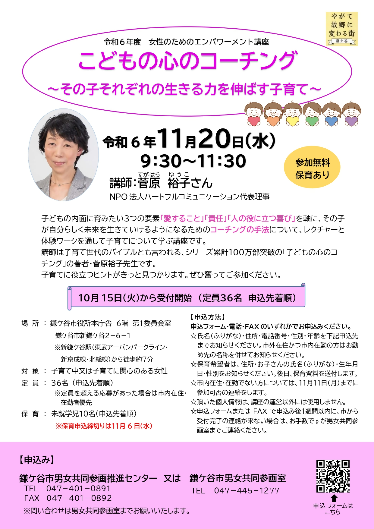 男女共同参画室が開催する「女性のためのエンパワーメント講座」、今回はシリーズ累計100万部突破「子どもの心のコーチング」の著者・菅原裕子さんを講師にお招きし、子育てがテーマの講座を行います。