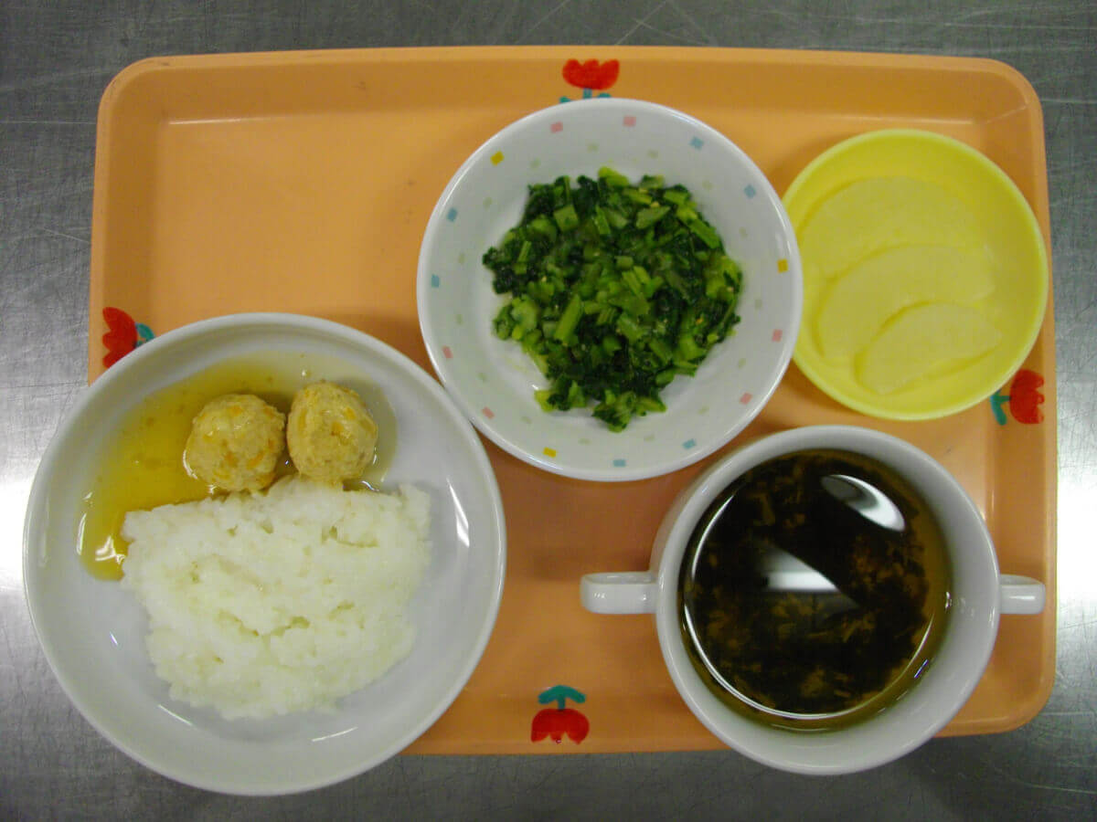 • 栄養士がたてた献立を調理師が園で作ります。心をこめた温かくおいしい給食です。